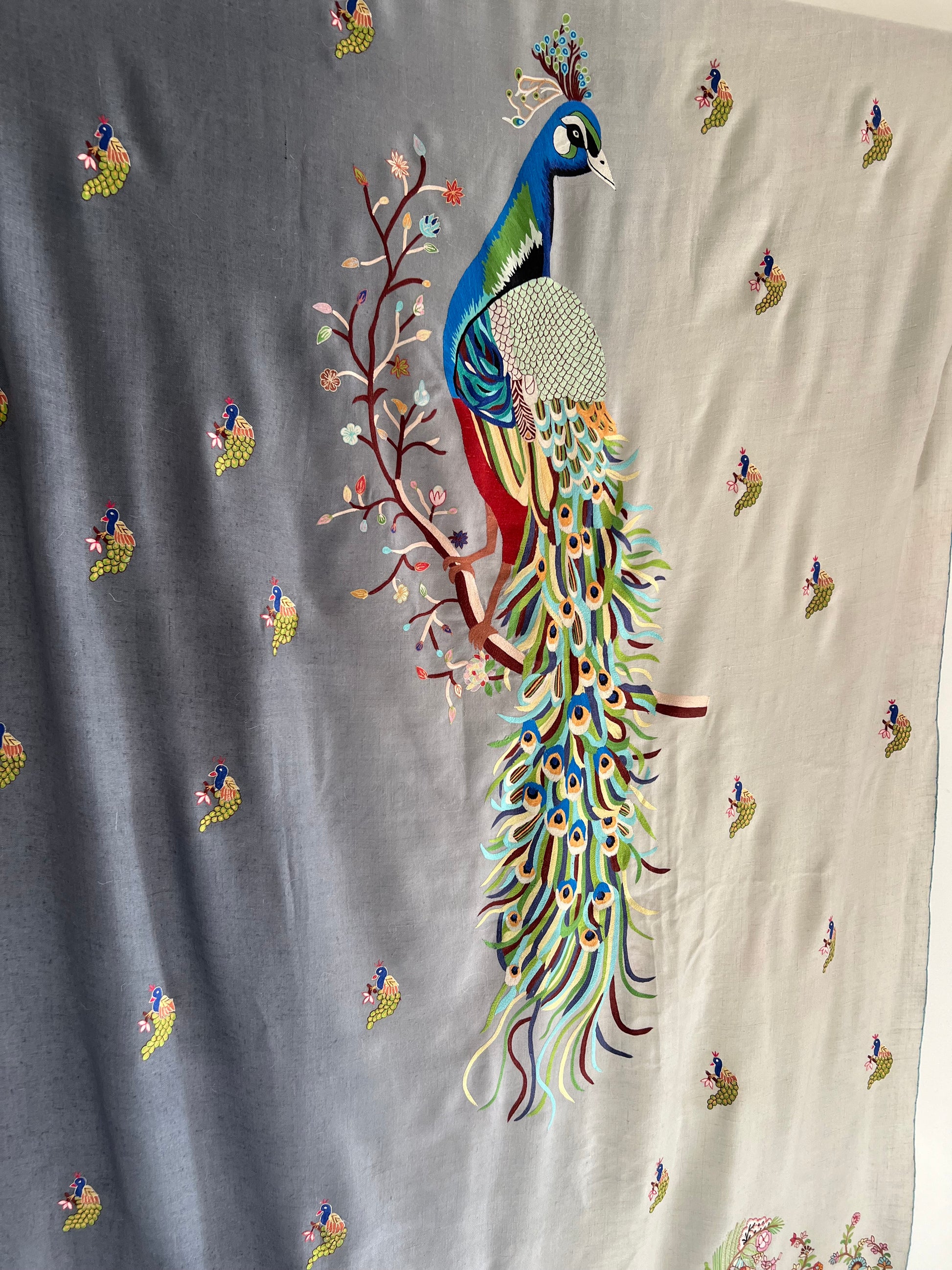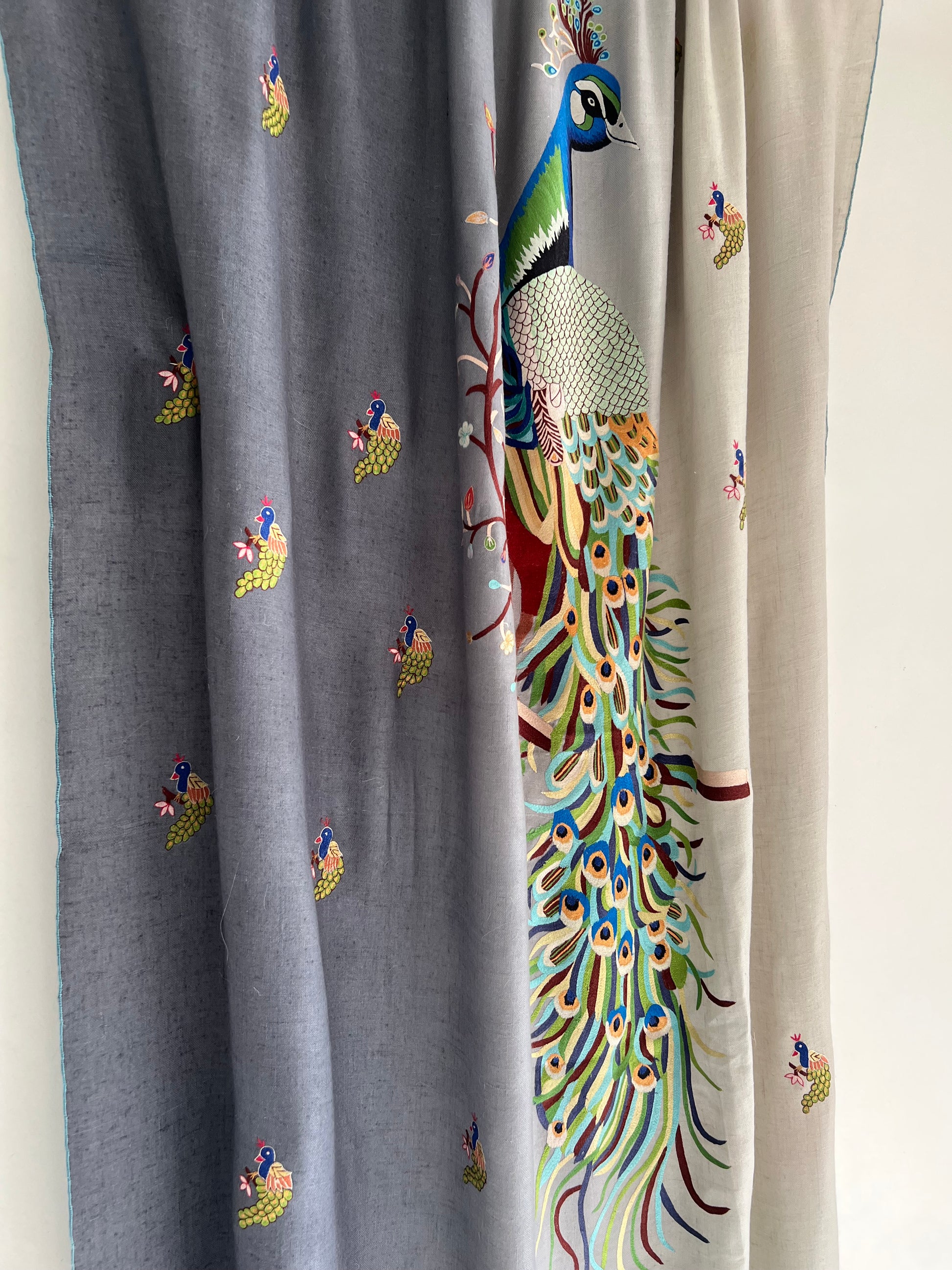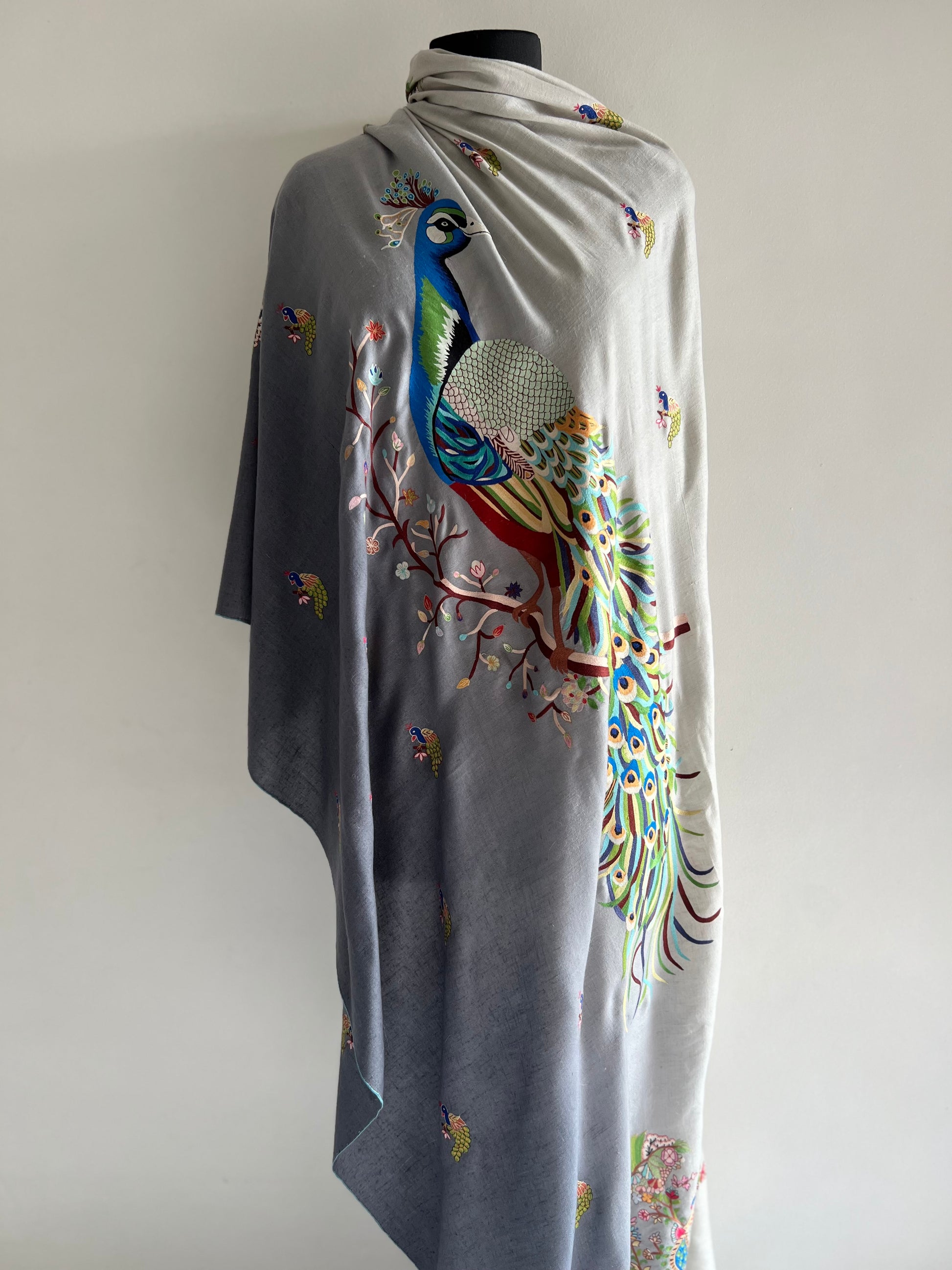 Pashmina ombre Shades of Grey Peacock Kalmkari Hand embroidery shawl